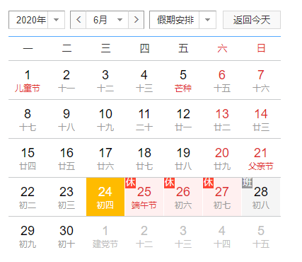 2020年6月25日(周四)至2020年6月27日(周六)放假調(diào)休,共3天。6月28號(星期日)正式上班。