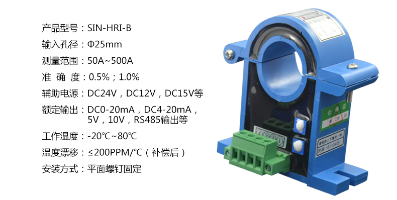 電流變送器可以直接將被測主回路交流電流或者直流電流轉換成按線性比例輸出的DC4~20mA(通過250Ω 電阻轉換DC 1~5V或通過500Ω電阻 轉換DC2~10V)恒流環標準信號,連續輸送到接收裝置(計算機或顯示儀表)。