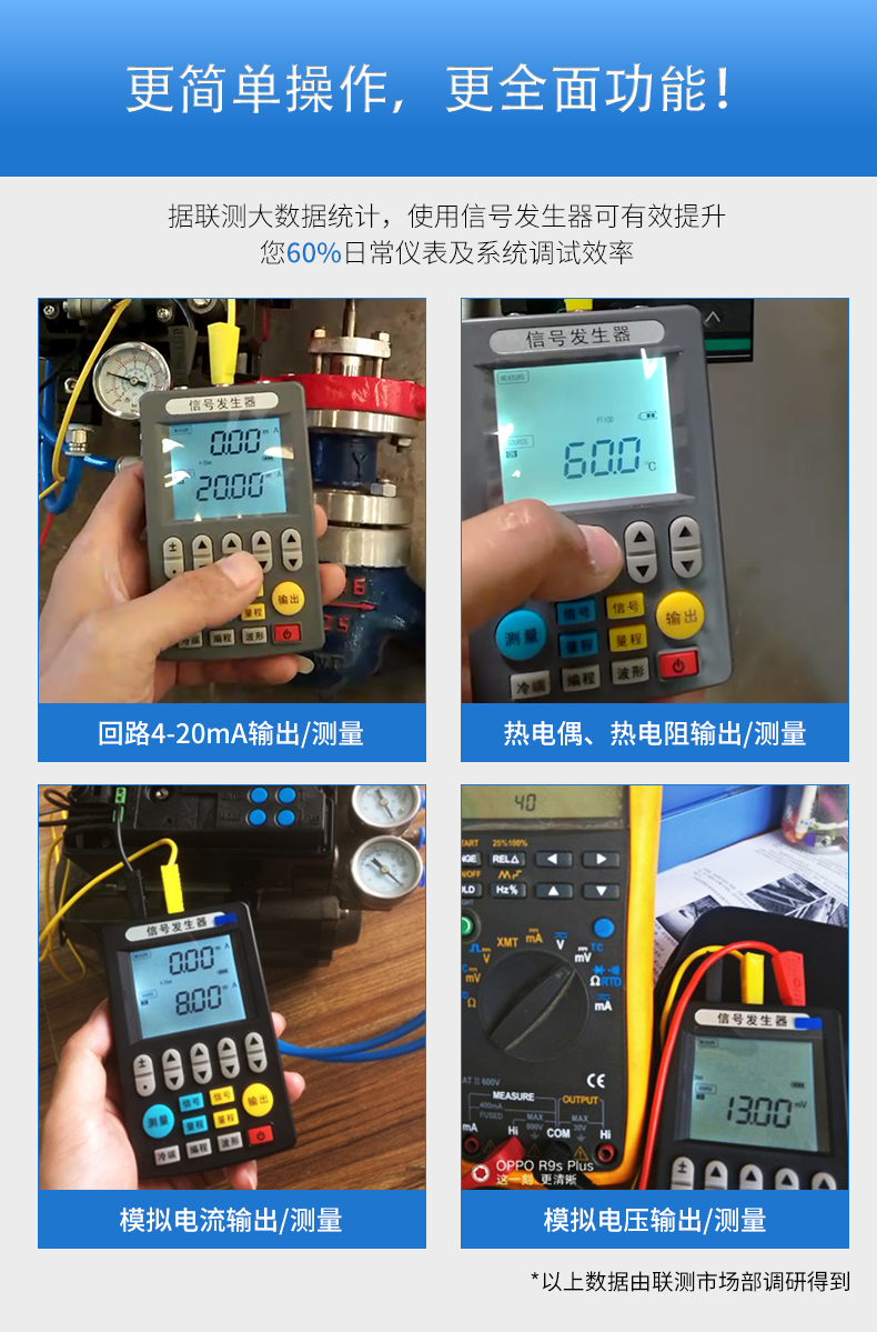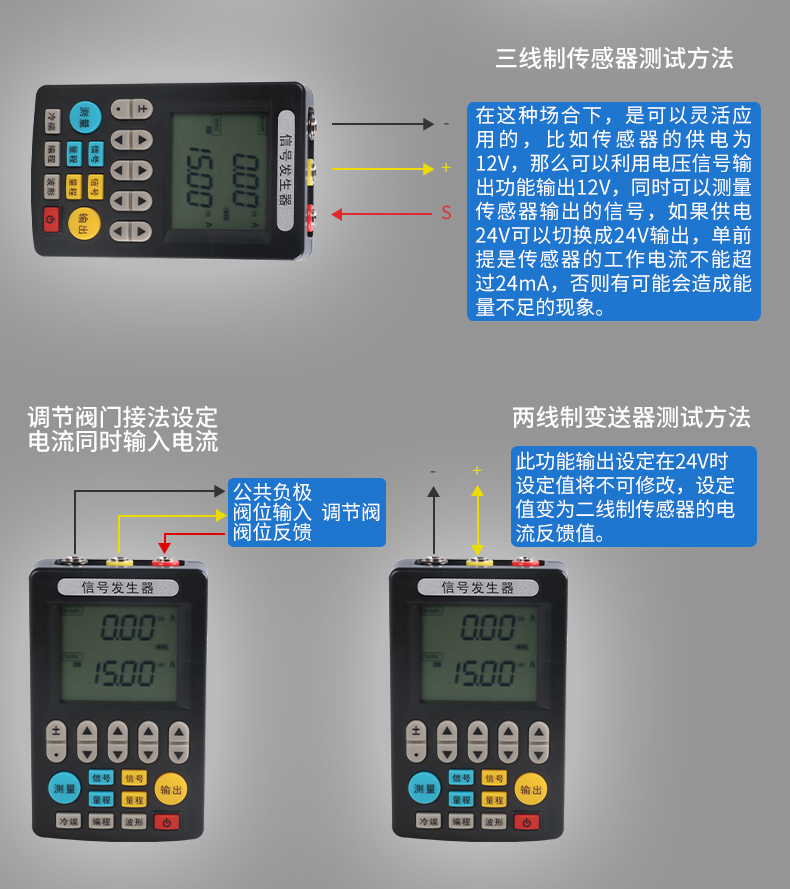 信號發(fā)生器具有多種信號的測量和輸出功能,包括電壓、電流、熱電偶,采用高清LCD液晶屏和功能分明的硅膠按鍵,操作簡單,待機(jī)時間長,精度高,并且具有可編程輸出的功能。