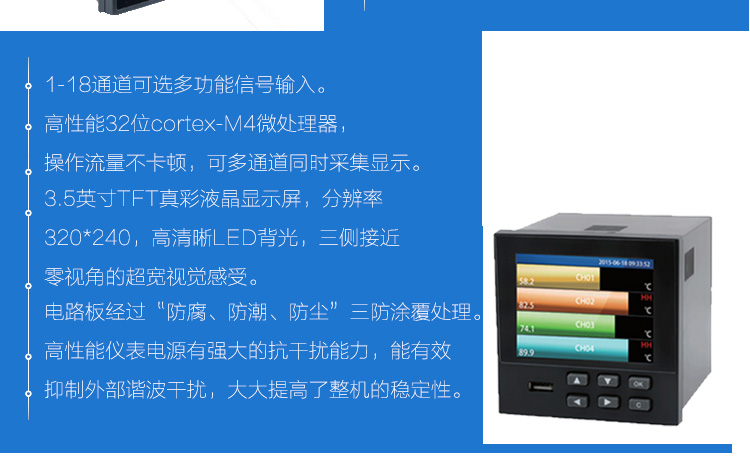 無紙記錄儀是將采集的數(shù)據(jù)/運算數(shù)據(jù)以時間為基軸記錄在儀器內(nèi)部的存儲系統(tǒng)中,無消耗任何常用的記錄設(shè)施,如:紙張、筆墨。記錄在儀器內(nèi)部的存儲數(shù)據(jù),通過運算、模擬后顯示在液晶屏。常用顯示用液晶屏比較廣泛。在液晶屏屏幕上,可以顯示數(shù)字顯示、棒圖顯示、曲線顯示、報警列表等。無紙記錄儀采集的數(shù)據(jù),常用的有:溫度、壓力、流量、液位、電壓、電流、濕度、頻率、振動、轉(zhuǎn)速等。