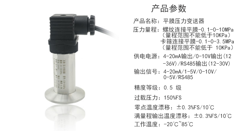平膜結(jié)構(gòu)壓力變送器采用波紋膜直接感受壓力。傳 感器平膜片防止了污垢,不衛(wèi)生及粘稠液體堵塞等問題。 具有體積小、重量輕、長期穩(wěn)定性好等特點,廣泛應(yīng)用 于食品、醫(yī)藥、衛(wèi)生及釀酒工業(yè)等行業(yè)。
