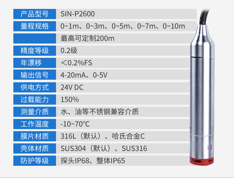 SIN-P260/P2600投入式液位變送器由高性能擴散硅壓阻式壓力傳感器作為測量元件,把與液位深度成正比的液體靜壓力準確測量出來